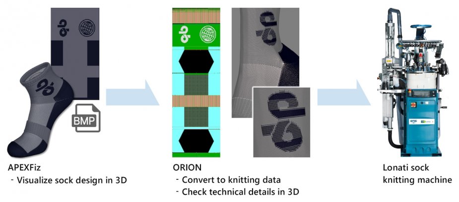 The proposed workflow combines Shima Seiki’s APEXFiz Design-Sox software, which offers dedicated 3D virtual sampling for socks, with Lonati’s ORION programming software, enabling users to verify data in 3D from a technical perspective. By integrating design, programming and manufacturing stages, potential issues can be identified and resolved earlier, supporting faster time-to-market while maintaining product quality.
